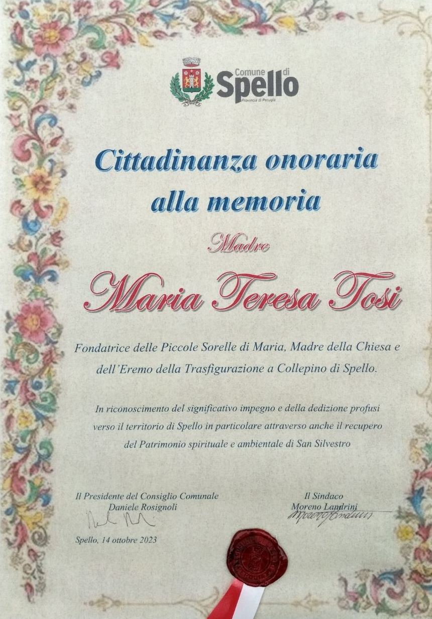 Editore, Il Formichiere, di Foligno. Mentre la Cittadinanza onoraria è stata conferita il 14 ottobre 2023.